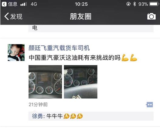 上圖為韻達快遞HOWO-T5G 6×2單車的駕駛員顏先生所發(fā)朋友圈。如您所見,在車輛滿載的情況下,油耗15.3升/百公里。該車在2016年4月投入運營,21個月運營45萬公里,運營效率持續(xù)領跑行業(yè)。顏先生更是自豪地在朋友圈中下戰(zhàn)書“中國重汽豪沃這油耗 有來挑戰(zhàn)的嗎!?”下圖為顏先生駕駛的跑出15.3L/百公里超低油耗的T5G 6×2單車。